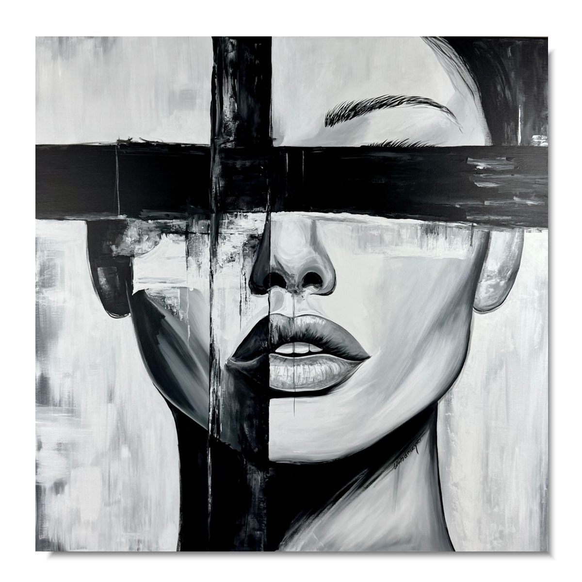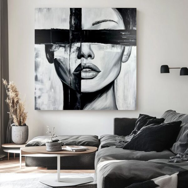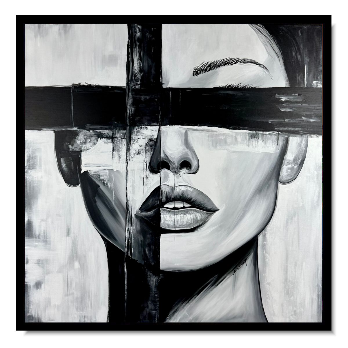 Współczesny portret obraz czarno biały „W niewoli” 2344A przedstawiający twarz silnej kobiety w monochromatycznej kolorystyce. Spokojny, nienachalny obraz do salonu lub sypialni. Duży nowoczesny portret jest doskonałą propozycją na prezent na ślub, urodziny czy rocznicę. Szukasz innego wymiaru – napisz do nas, namalujemy.