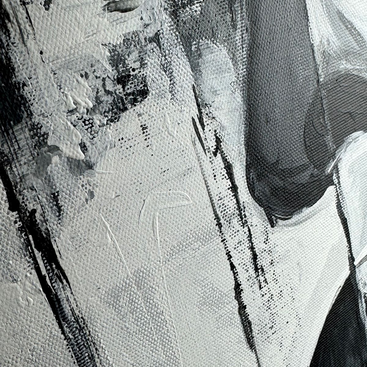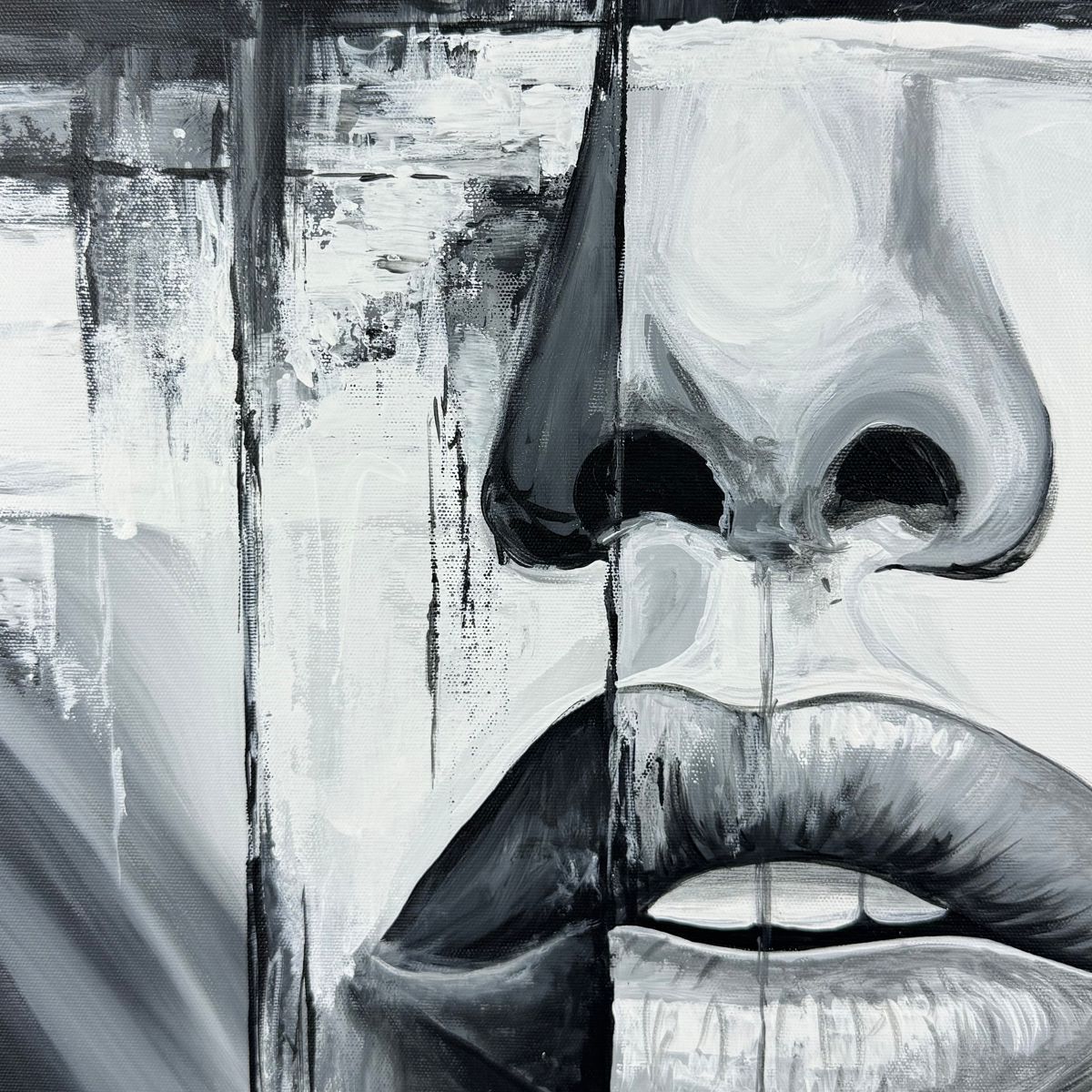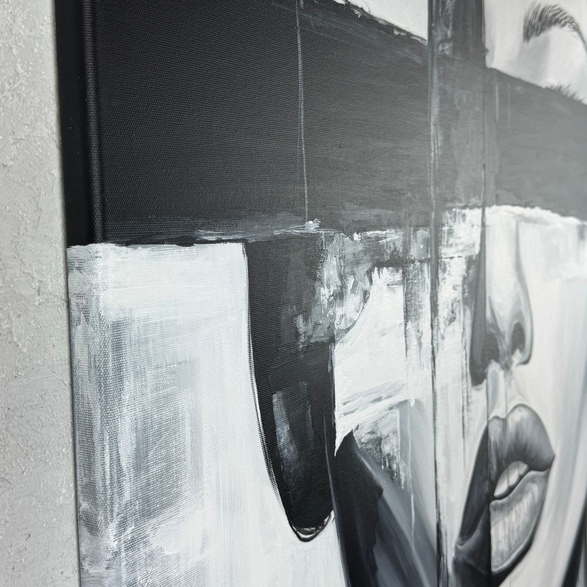 Współczesny portret obraz czarno biały „W niewoli” 2344A przedstawiający twarz silnej kobiety w monochromatycznej kolorystyce. Spokojny, nienachalny obraz do salonu lub sypialni. Duży nowoczesny portret jest doskonałą propozycją na prezent na ślub, urodziny czy rocznicę. Szukasz innego wymiaru – napisz do nas, namalujemy.